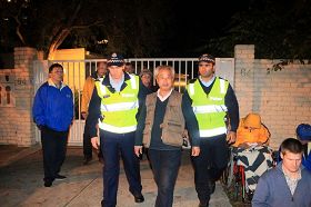 执勤的警察见状,前来干预。起初这个男子仍打算继续纠缠,但两位警察命令他回到领馆内。看到警察已经把他夹在中间,并准备开始架他的姿势,该男子只好放弃闹场行为,在警察的押送下返回领馆内。