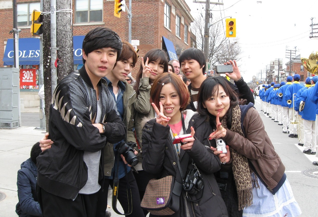 刚到多伦多一个月的日本留学生莉娜(Lina,中)和她的同学们对着天国乐团欢呼,他们表示在加拿大第一次看到这么大规模的华人乐队很激动,也很喜欢。