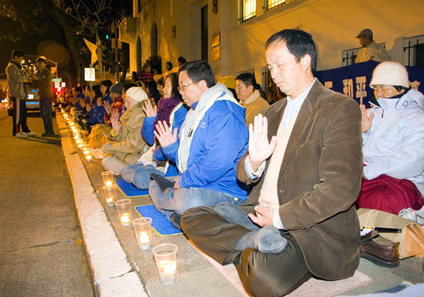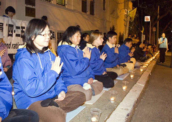 【明慧网二零一一年四月二十七日】(明慧记者王英旧金山报导)二零一一年四月二十五日晚,加州旧金山近二百名法轮功学员在旧金山中领馆前举行烛光悼念会,为纪念十二年前的“四•二五”,法轮功学员在北京国务院信访办集体上访的和平理性之举,同时也为悼念三千多名失去生命的大法弟子,抗议中共残酷迫害法轮功学员犯下的罪行。