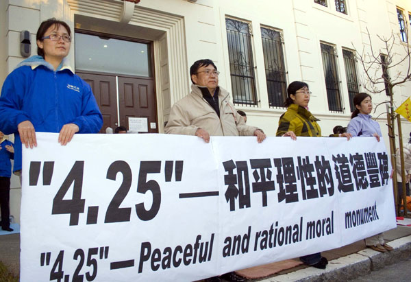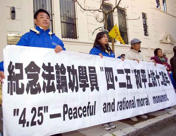 纪念“四•二五”,旧金山法轮功学员中使馆前和平反迫害