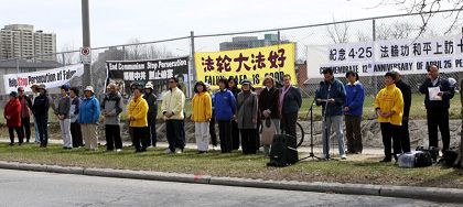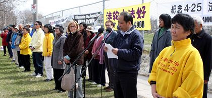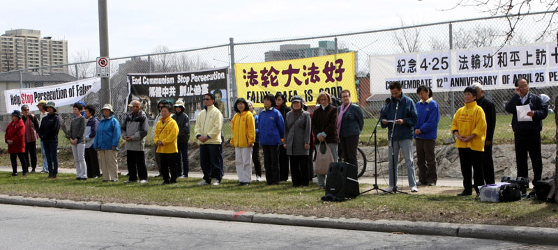 四月二十五日,渥太华的中西方法轮功学员在中使馆前和平抗议,纪念十二年前被誉为“道德丰碑”的万名法轮功学员在中南海前的和平上访。
