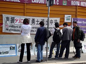四月二十五日一早,法轮功学员来到靠近中共驻罗马大使馆的街区人行道上举办讲真相活动,纪念法轮功学员“四•二五”上访十二周年,要求中共停止迫害法轮功。在活动快结束时,一位意大利女士在认真看完真相展板后,告诉学员:她有四十年的记者生涯,现在已经退休,她知道中国的人权状况是非常糟糕的,她非常支持学员的诉求。