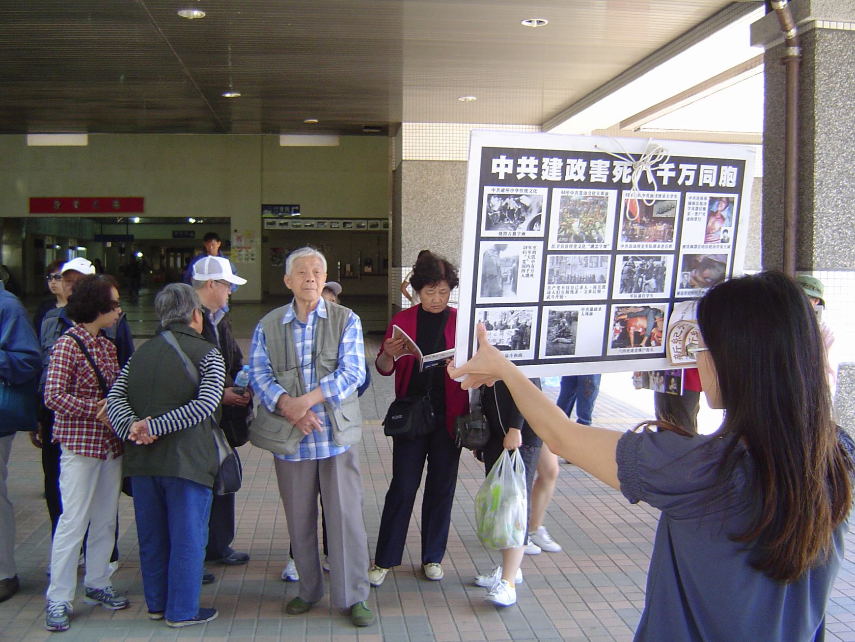 法轮功学员在列车抵达前就聚集车站出口处,手持真相展板,吸引许多中国游客的目光,有些人兴奋地拿起相机拍摄这景象。长期在此讲真相的学员游先生表示,有些游客看到举展板的学员,会拍手鼓掌或点头致意,有的竖起大拇指表示佩服,或说你们辛苦了。也有游客主动表明:我已经退过党了,或双手合十表示谢意。