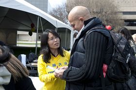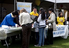 当天除了很多西方学生,还有中国学生前来咨询。他们表示在国内的时候听了很多关于法轮功的谣言。不过他们已经看清了中共虚假宣传的嘴脸,所以他们对当局的宣传表示怀疑。法轮功学员给他们大法真相资料,他们表示回去后会仔细看。