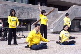 ![]() 法轮功学员在表演台上示范功法,广传真相。 |