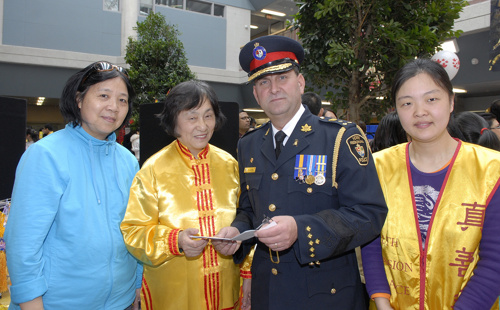 四月三日,加拿大安省约克区庆祝国际消除种族歧视日,约克区警察总长埃里克•乔利夫(Eric Jolliffe)与法轮功学员在一起。