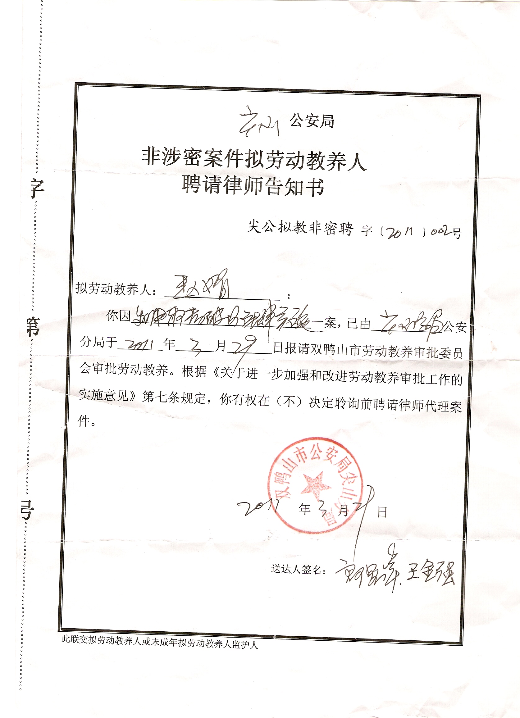 即使赵娟已回到家中,二零一一年三月二十九日,双鸭山市公安局尖山分局还是将赵娟报到双鸭山市劳动教养审批委员会,图谋劳教迫害。三月三十日,借送《非涉密案件拟劳动教养人聘请律师告知书》之机,再次将赵娟劫持,不知去向。