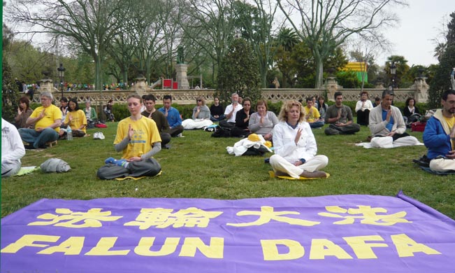 【明慧网二零一一年四月八日】二零一一年四月三日,西班牙法轮功学员在巴塞罗那著名的凯旋门公园集体炼功,向人们介绍以“真、善、忍”为原则的修炼功法——法轮功。