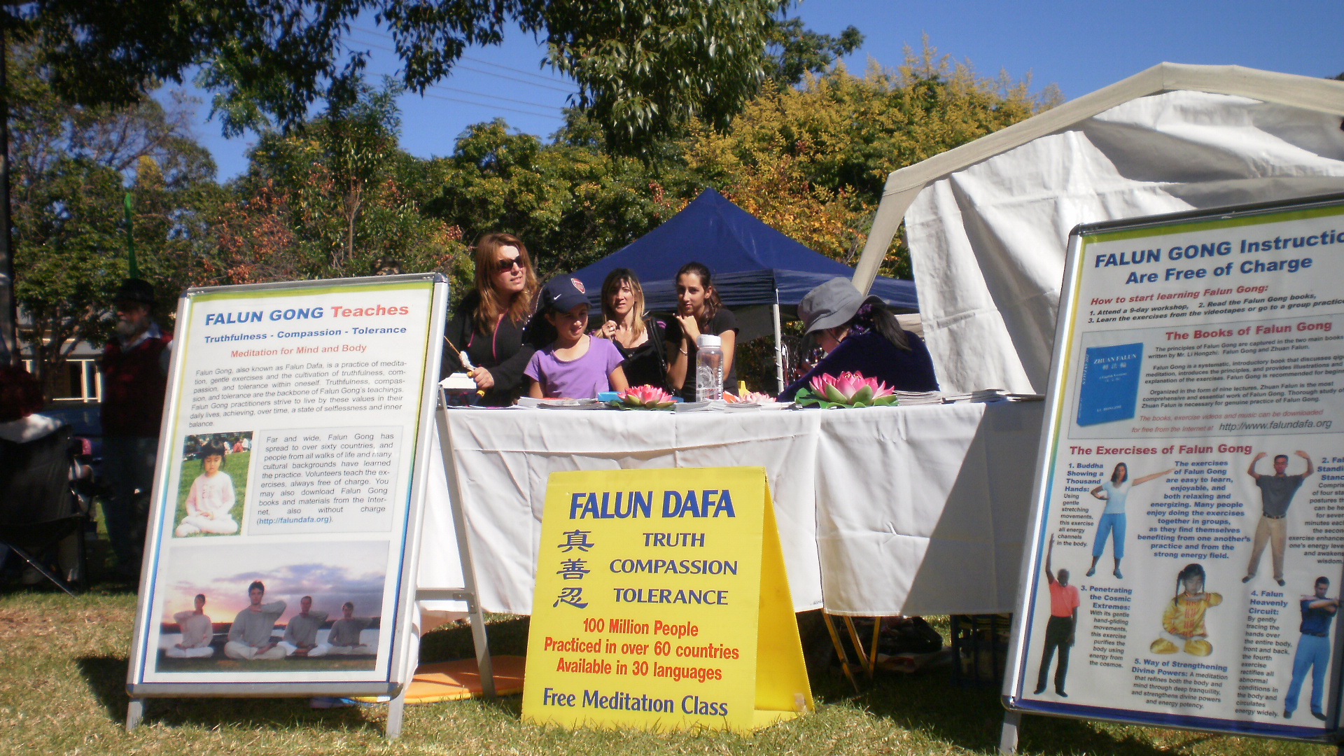 法轮功学员在圣彼得社区活动中摆设展位,介绍功法