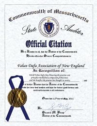 二零一一年五月七日,波士顿法轮功学员举办活动,欢庆即将来临的“五·一三”世界法轮大法日。美国麻州众议员希恩·戈巴利(Sean Garballey)为此颁发褒奖,祝贺世界法轮大法日的庆典和法轮大法修炼者十二年来维护“真、善、忍”的坚定和勇气。以下是褒奖译文: