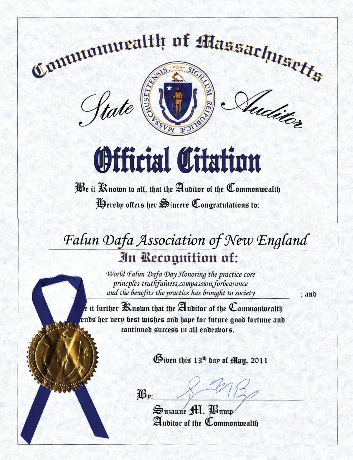 美国麻州审计厅厅长苏珊·班彭(Suzanne Bump)褒奖新英格兰法轮大法学会,祝贺世界法轮大法日。以下为褒奖译文: