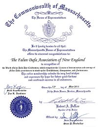麻萨诸塞州众议院向新英格兰法轮大法学会致以最衷心的祝愿!
