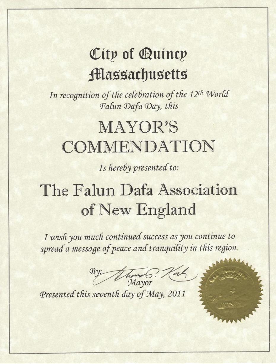 二零一一年五月七日,波士顿法轮功学员举办活动,欢庆即将来临的“五·一三”世界法轮大法日。美国麻萨诸塞州昆西市(Quincy)市长托马斯·寇奇(Quincy Mayor)为此颁发褒奖。褒奖译文如下: