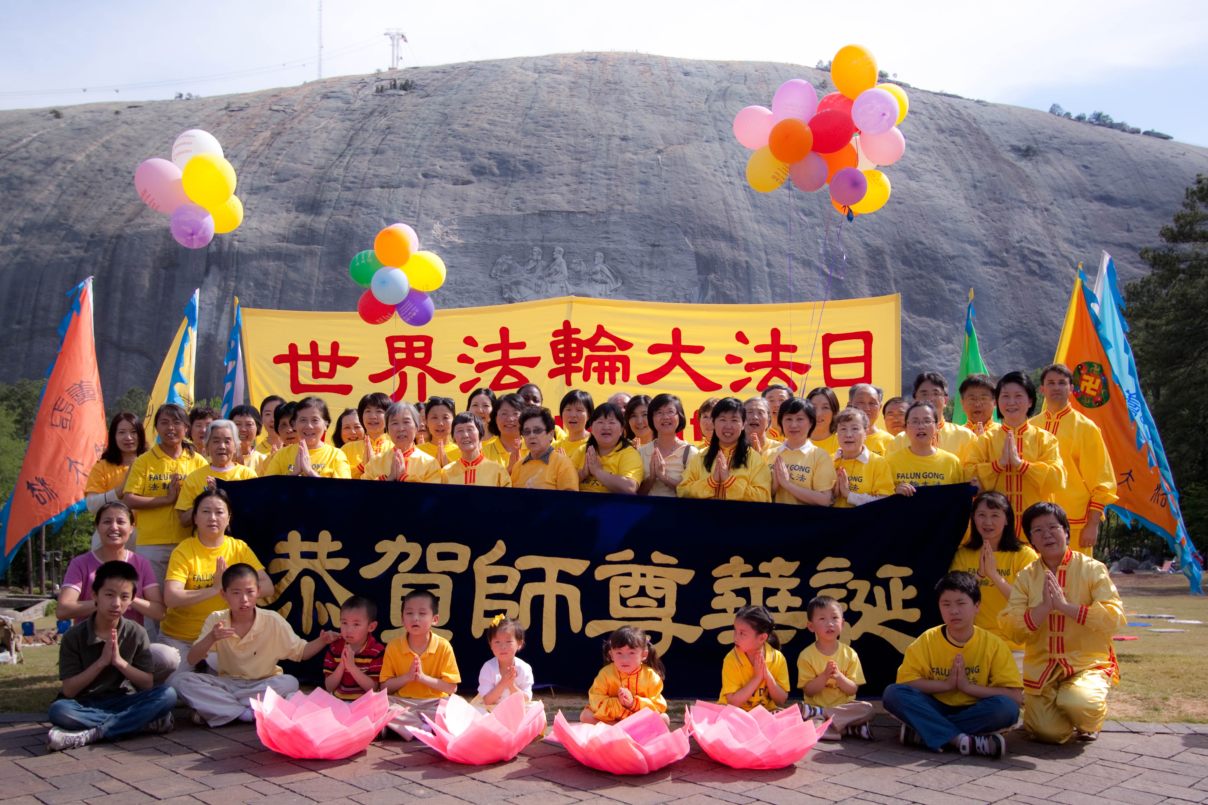 亚特兰大学员在石头山公园庆祝“世界法轮大法日”,并恭祝师尊六十华诞