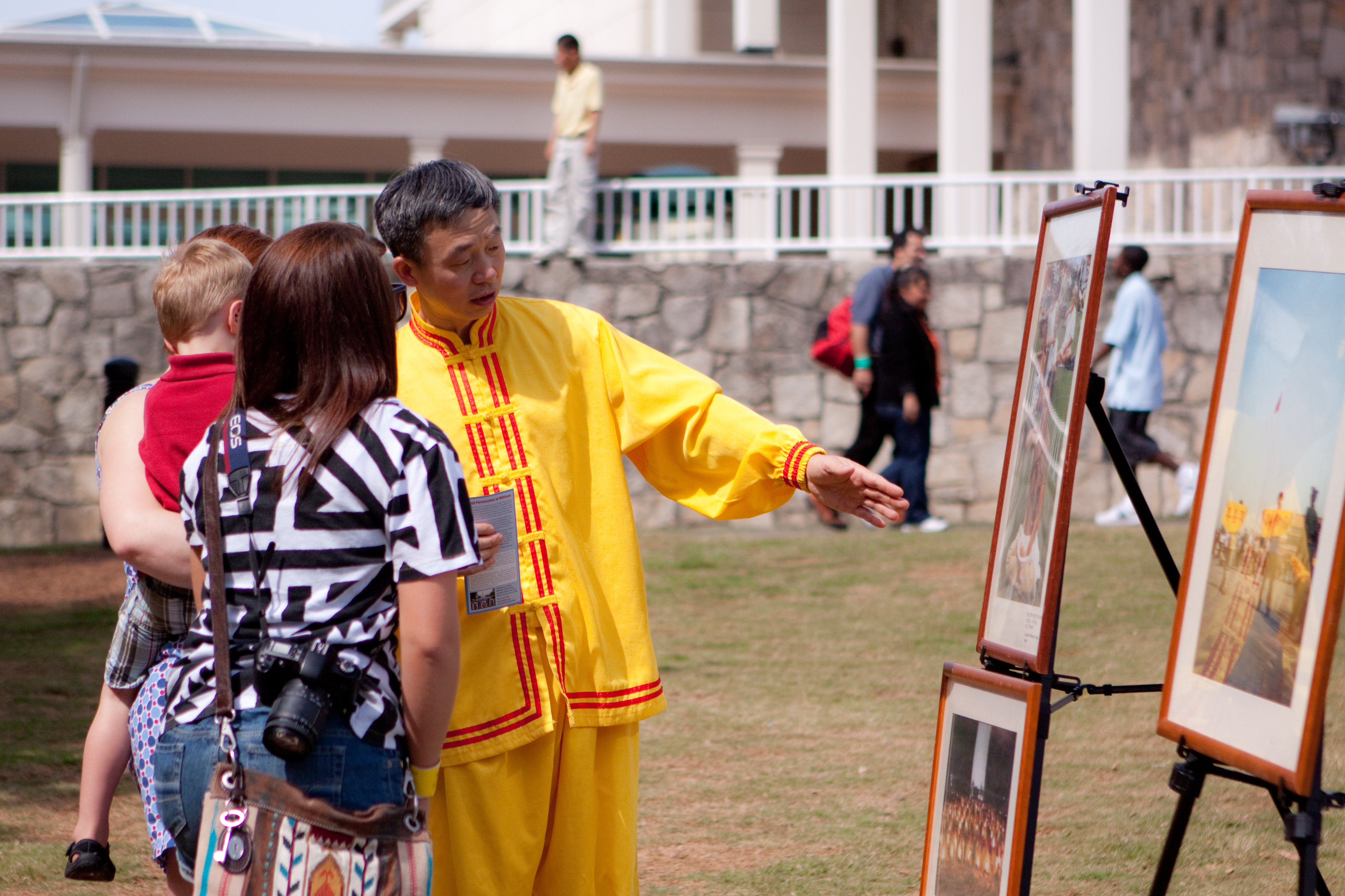 学员们在公园的草坪上摆起几十幅展板,以图片和简介的形式,向公园的游客介绍法轮功的佛法修炼,并向民众讲述中共对法轮功的迫害,以及中共当局活体摘取法轮功学员器官的暴行。一位游客是美国海军的供应商,刚刚去中国杭州旅游过,他很清楚地知道中共对互联网的封锁,今天他第一次听说法轮功和中共对法轮功的迫害,感到非常震惊和愤慨。