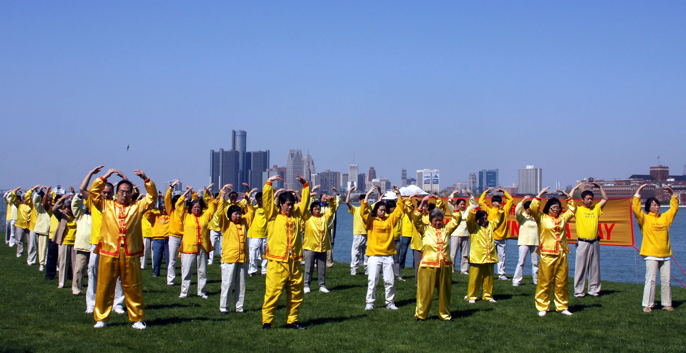 ![]() 美国大底特律地区的部份法轮功学员们在底特律河畔集体炼功 |