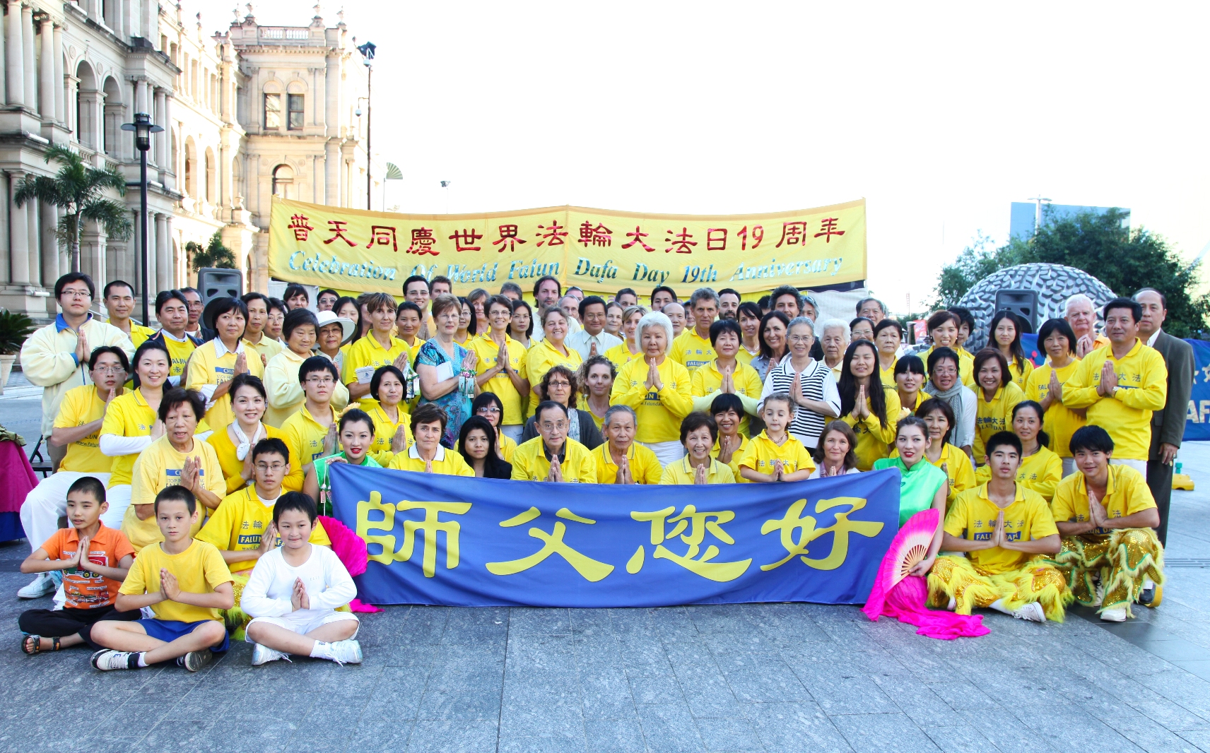 每年的世界法轮大法日对法轮功学员们而言是一个相当特殊和重要的日子。今年是法轮大法弘传世界十九周年,同时也是创始人李洪志先生六十岁生日,学员们共同庆祝这意义非凡的盛会。除了布里斯本当地的学员外,还有来自黄金海岸、阳光海岸、以及特地乘坐飞机前来参加活动的凯恩斯(Cairns)和佩斯(Perth)学员们。