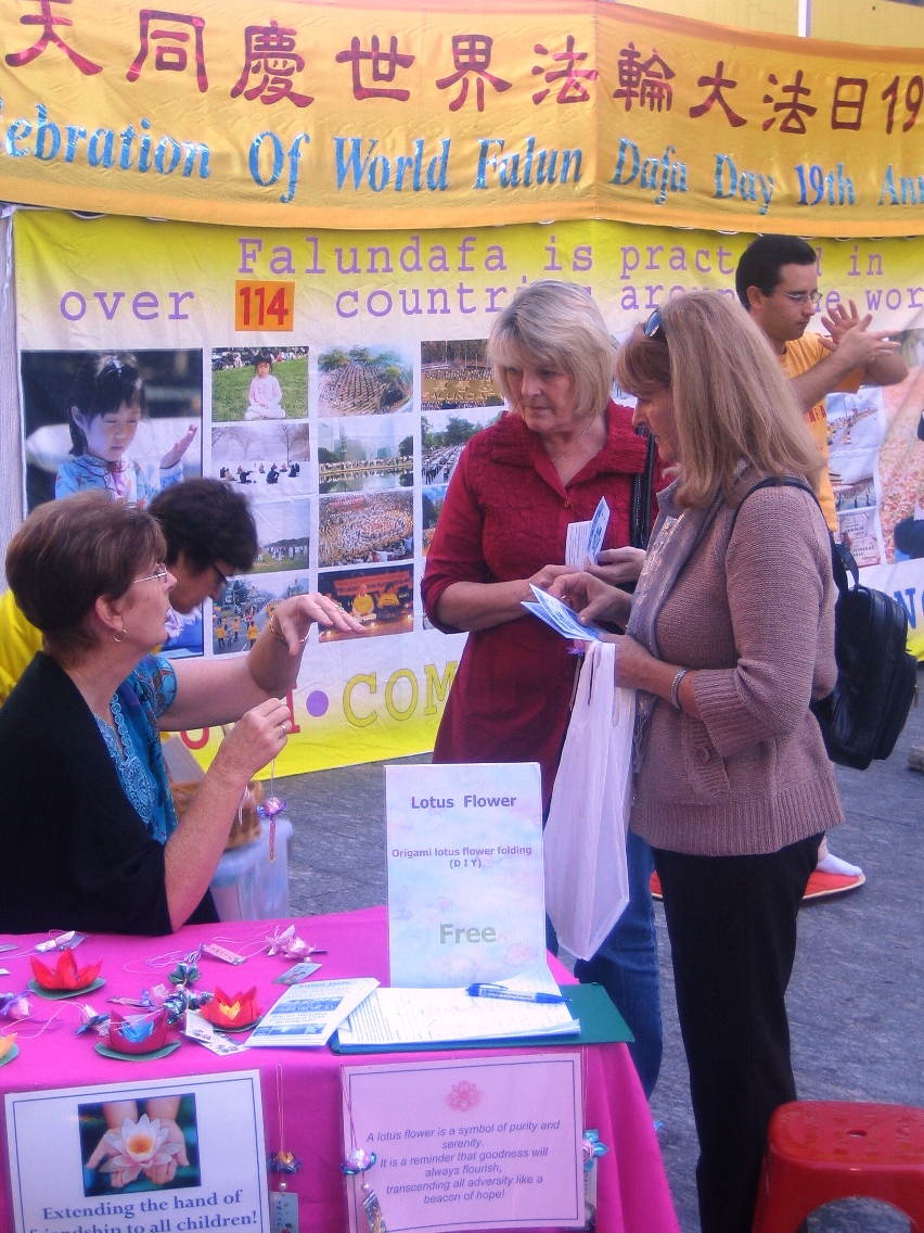 为期两天的庆祝活动吸引了各阶层、各族裔的嘉宾和民众前来共襄盛举。活动内容包括在布里斯本市中心举行的贵宾招待会、功法展示、“法轮功的故事”图片展、中华传统文艺表演等。学员以毛笔为民众书写中文名字和示范折叠纸莲花更为活动增添不少乐趣。次日,在布里斯本南区举办“法轮大法的真实故事”短片放映后,学员和来宾们也一同庆祝法轮功创始人李洪志先生的六十华诞。