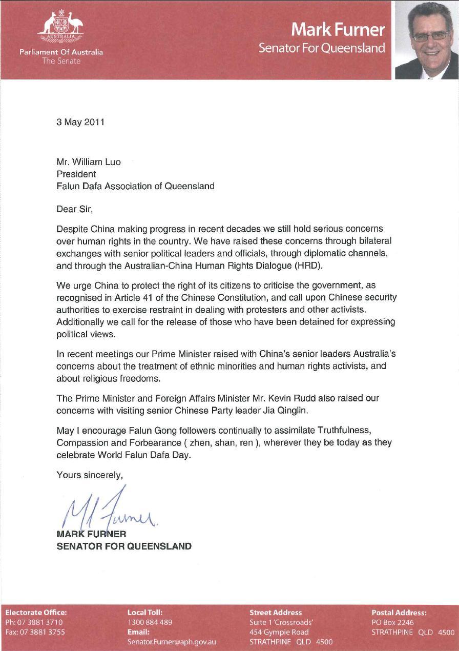 昆省参议员马克·费纳(Senator Mark Furner)在贺信中表示,澳洲政府对中国的人权现状极度关注,他呼吁中共政权遵守中国宪法第四十一条,使国民享有督促政府及上访和抗议的权利。同时他也要求中共释放异议人士,并对中国少数民族、维权人士和信仰自由遭受迫害表示关注。