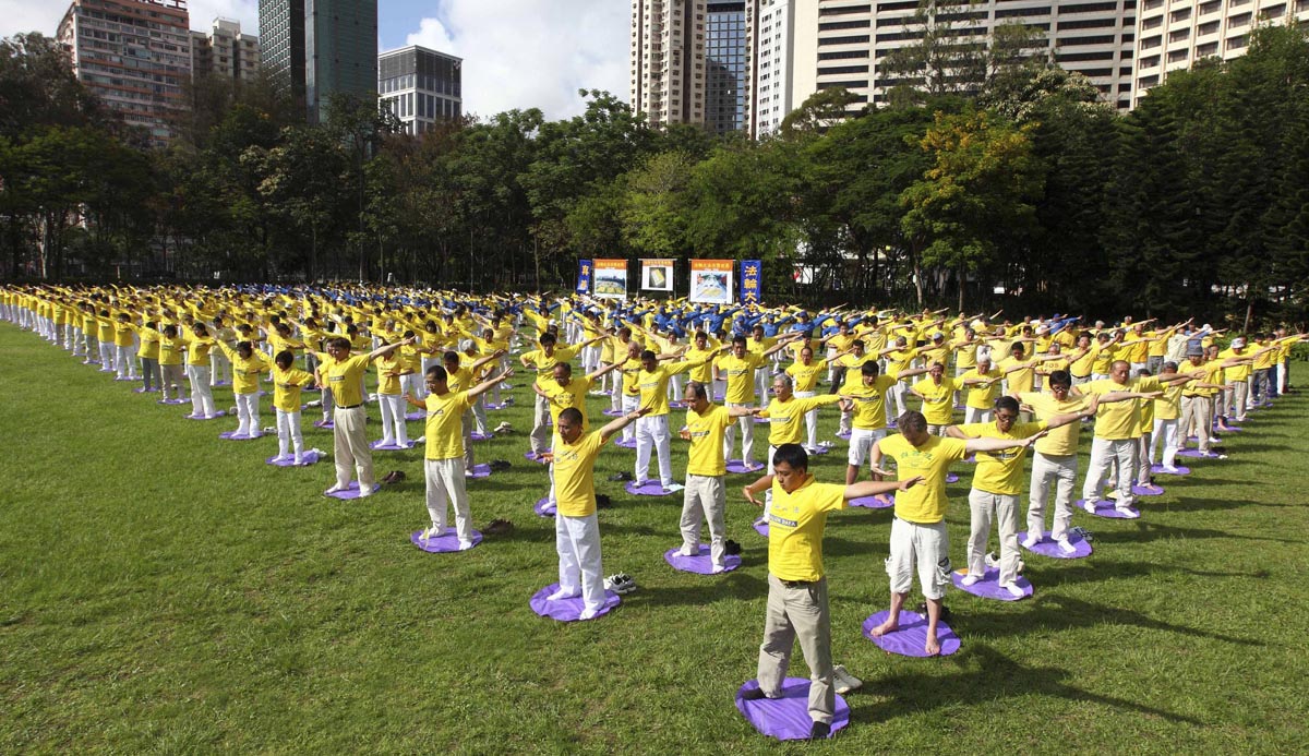 五月十日刚好是香港的公众假期,逾三百名学员身穿黄色炼功服,一早聚集在维多利亚公园的草地上,在祥和的音乐中演炼法轮功的五套功法,整齐优美的动作在晨光中显得格外耀眼。他们当中有老有少,有的已经修炼了十多年,有的近年才得法。谈到修炼大法的体会,学员们都深深感到,学炼法轮功受益良多。