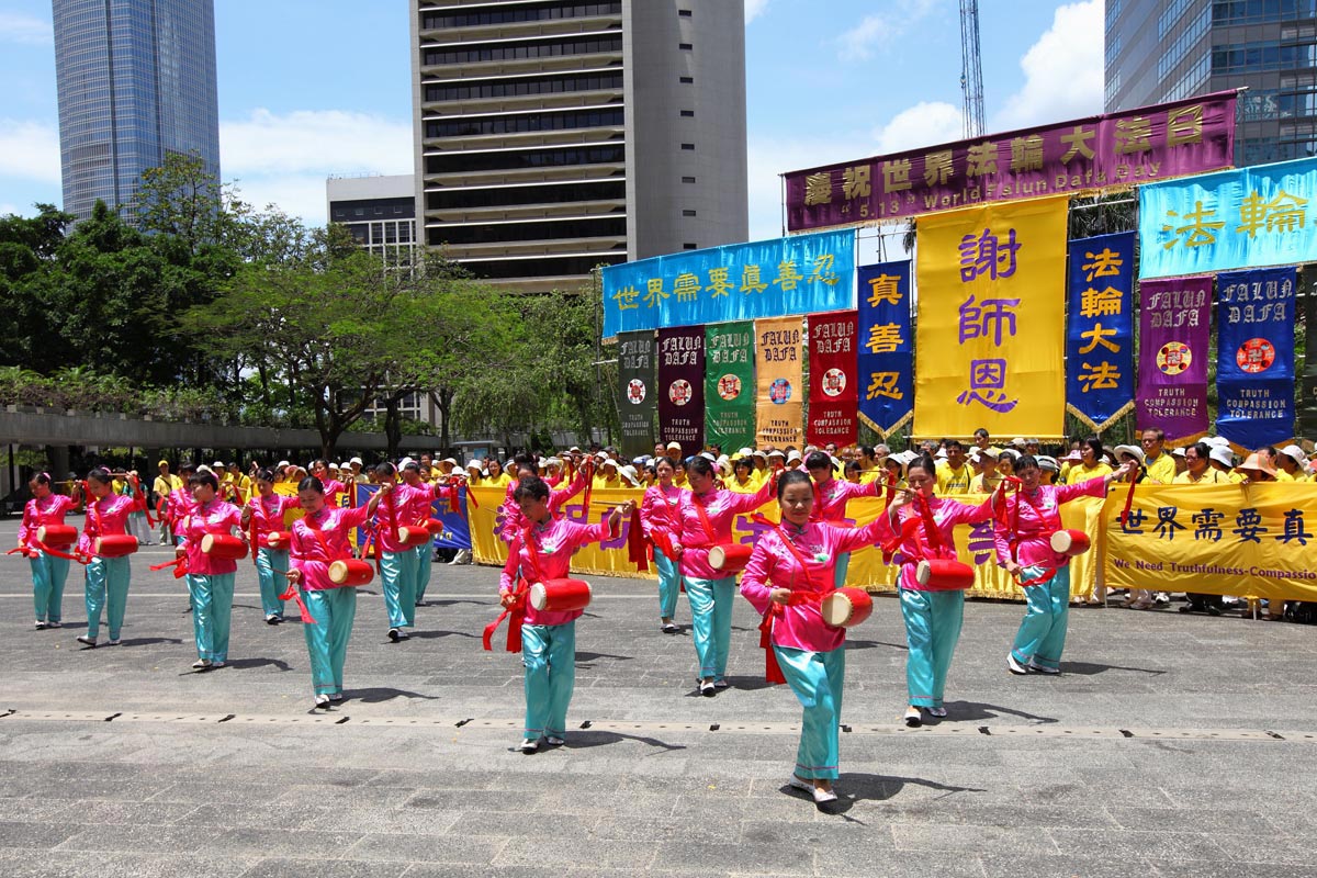 【明慧网二零一一年五月十二日】二零一一年五月十三日是第十二届世界法轮大法日,也是师尊李洪志先生六十华诞。在普天同庆的佳节即将来临之际,五月十日,身在香港的本地及外地法轮功学员举行庆祝活动,通过集体炼功、游行、鼓乐表演、齐声祝贺及歌唱等形式,欢庆法轮大法洪传十九周年,向世人展现大法的美好,同时感颂师恩,恭祝慈悲伟大的师尊生日快乐。