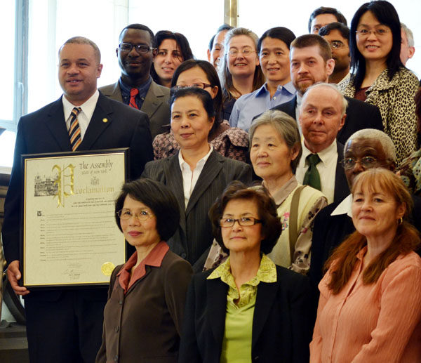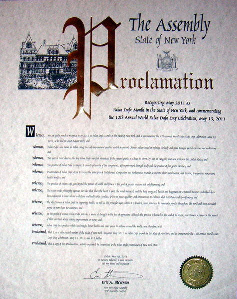 【明慧网二零一一年五月十二日】(明慧记者采菊综合报道)为表彰法轮大法为纽约州作出的杰出贡献,美国纽约州众议员艾里克·史蒂文森(Eric Stevenson)在二零一一年五月十日的州众议会上宣读褒奖,表彰“法轮大法月”和“二零一一年五月十三日---世界法轮大法日”,并邀请法轮大法学员出席议会,接受褒奖。州众议院大厅内,议员们纷纷鼓掌表示赞赏。