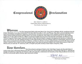 - 美国会众议员安德鲁斯表彰世界法轮大法日- 新泽西州第一选举区的美国国会众议员罗伯特E. 安德鲁斯颁发褒奖,表彰世界法轮大法日的重要性,庆祝真、善、忍的胜利,同时,纪念数以千计和平地捍卫信仰和人权而失去生命的法轮大法修炼人。