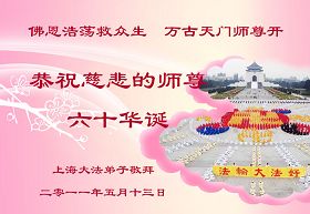 - 华东大法弟子贺师尊华诞暨法轮大法日(140地)- 每年的5月13日,世界各地的法轮大法弟子,都向明慧网寄来贺卡贺词,恭贺师尊华诞,并庆祝“世界法轮大法日”。
