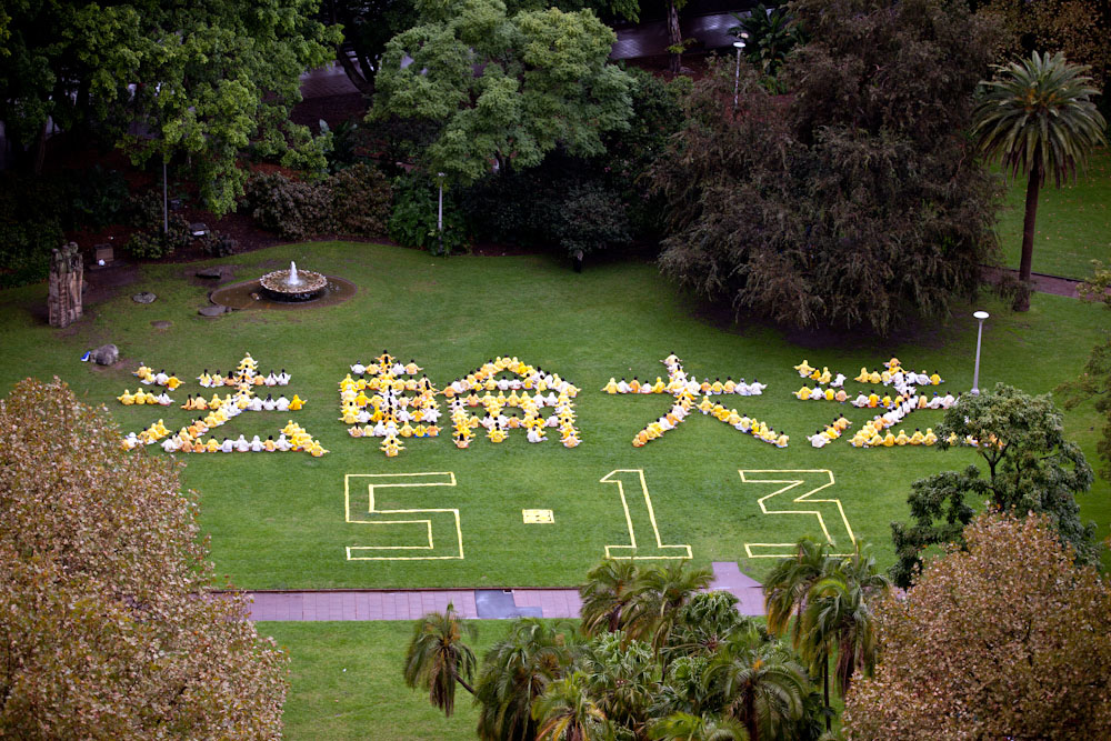 ![]() 庆祝“世界法轮大法日”,悉尼法轮功学员聚集在市中心的海德公园( Hyde Park )举行排字活动。 |