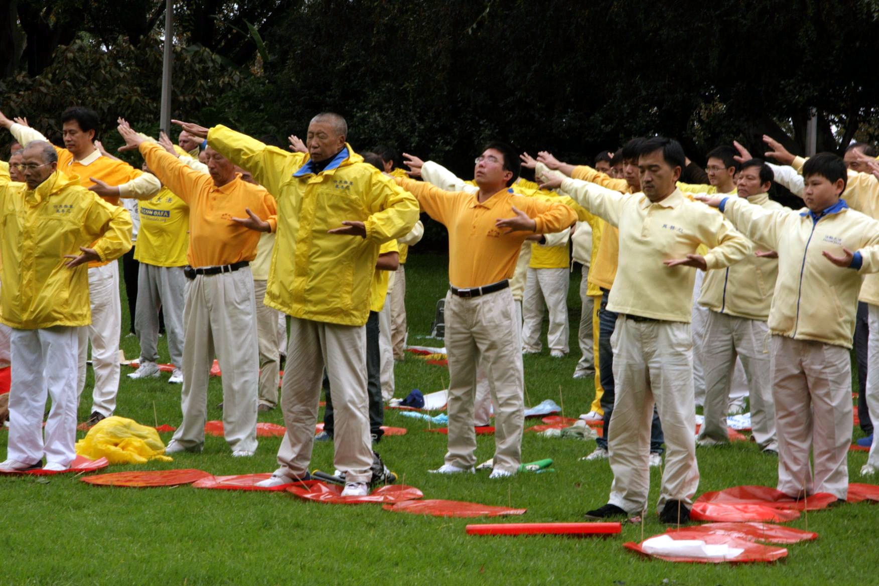 在绿草地上,约四百名法轮功学员身着黄色、白色服装,以排出「法轮大法」字样,并演炼法轮功五套功法,场面壮观。尽管当时下着绵绵小雨,祥和的炼功场面仍吸引了许多来往的游客,他们停下脚步,用手中的相机记录下这美好的一幕。许多游人从学员手中接过介绍法轮大法的传单,表示要更多的了解法轮功。