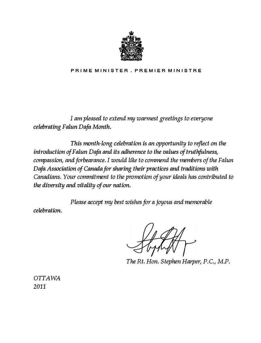 每年的五月,是加拿大庆祝法轮大法弘传世界的月份,加拿大总理哈珀已经是连续第六年给法轮大法月发贺信。哈珀表示,他很高兴向参加法轮大法月庆祝活动的每个人致以最诚挚的问候。