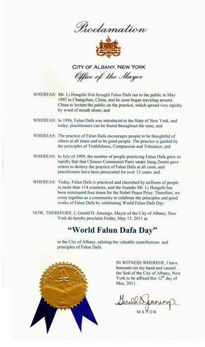 为此,我,纽约奥尔巴尼市市长杰拉尔•德•詹宁斯(Gerald D. Jennings),特此褒奖二零一一年五月十三日星期五为奥尔巴尼市的世界法轮大法日,以向法轮大法的广泛传播和信念表达敬意。