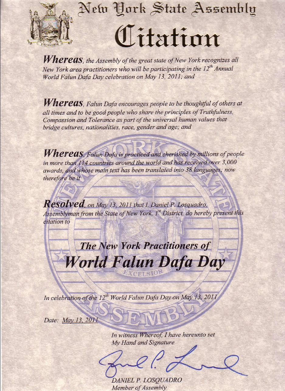 鉴此,我,纽约州第一选区众议员丹尼尔•库斯奎卓于二零一一年五月十三日做出决议,向纽约法轮大法修炼者签发世界法轮大法日的褒奖令,以庆祝第十二届世界法轮大法日“二零一一年五月十三日”。
