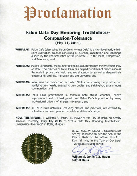 鉴此,我,密苏里州罗拉市(City of Rolla)市长威廉姆斯•詹克斯(Williams S. Jenks, III),特此宣告二零一一年五月十三日为罗拉市