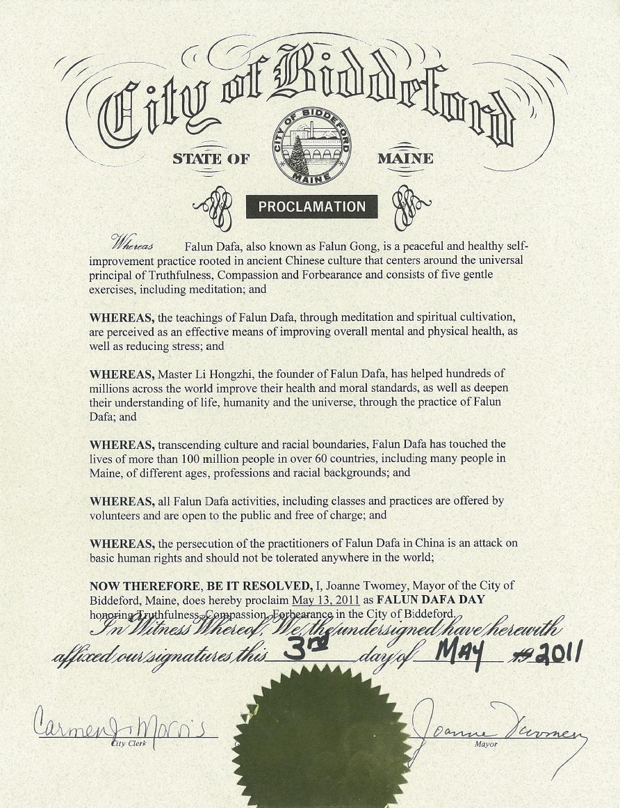 因此,我,缅因州比迪福德市市长乔安妮•特伍梅宣布二零一一年五月十三日为比迪福德市“法轮大法日”,以表彰“真、善、忍”。