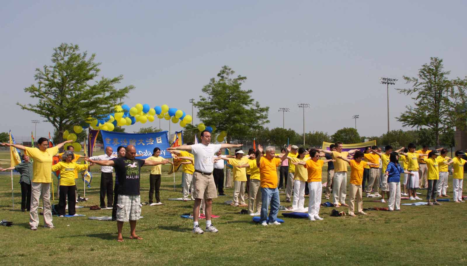 ![]() 达拉斯法轮功学员在布兰诺市卢梭•可瑞科公园集体炼功 |