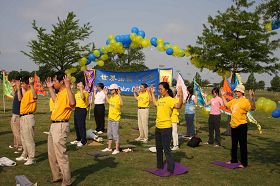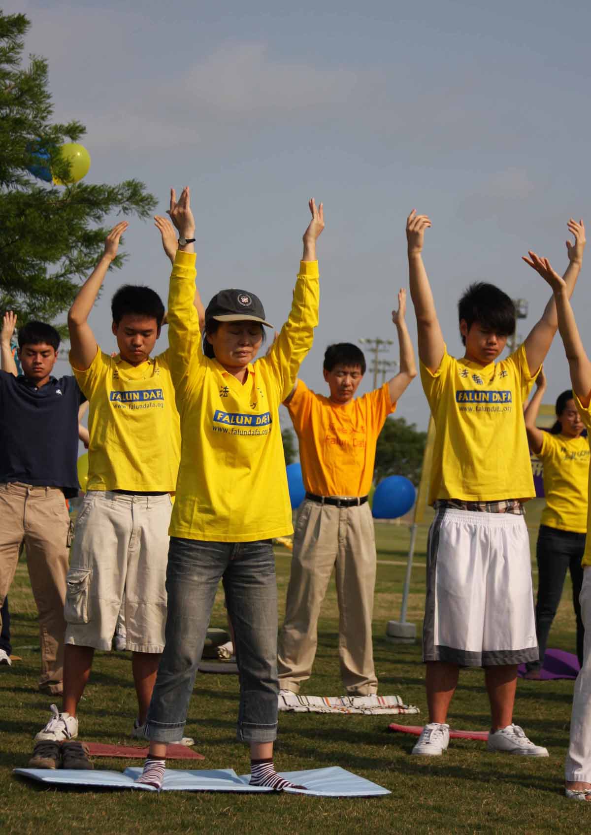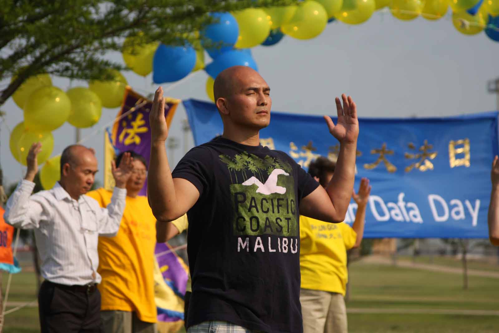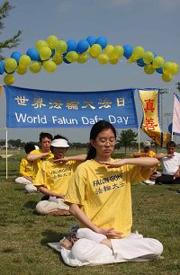 ![]() 得法修炼一年的杜克参加集体炼功,庆祝世界法轮大法日 |