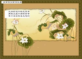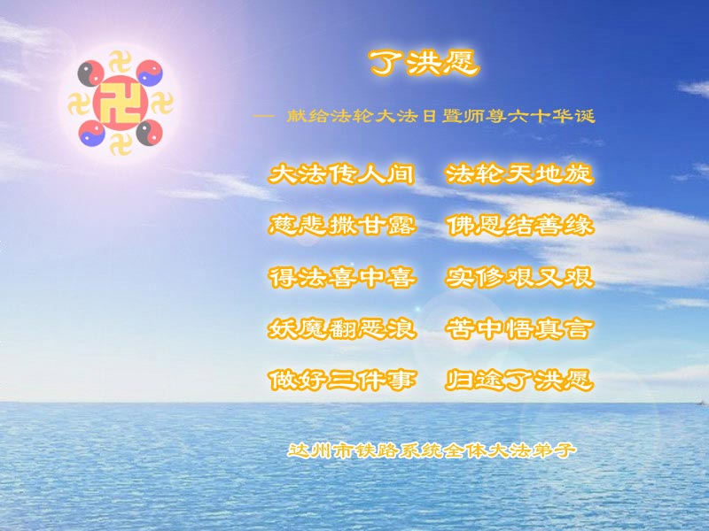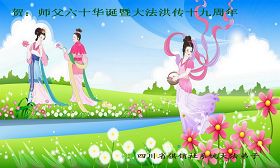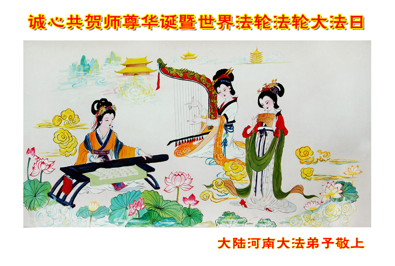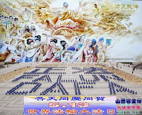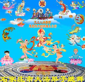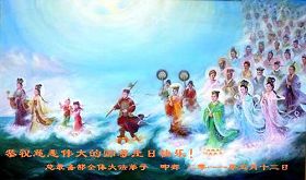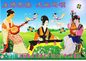 伴随着这种景象,响起了一种奇幻的音乐,并且有着天女散花。那时的我,心中有一种格外的崇敬,感觉是那样的纯正,又是那样的神圣,由衷的在心里唱起了《普度》、《济世》、《法轮大法好》等法轮功乐曲和歌曲。