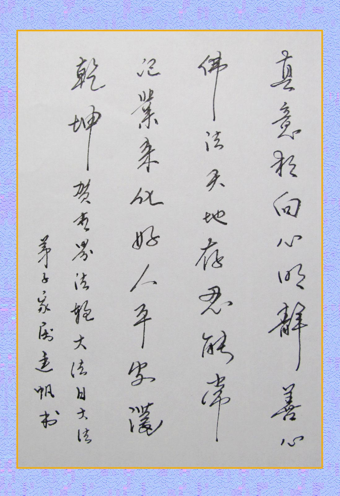 学习班上,师父讲的都是我们从来都没有听到过的理,字字入心。我每天很认真的听课,生怕听漏了一句话,生怕听掉了一个字,记得师父告诉我们这样一层意思:气功就是修炼,宇宙是有特性的,宇宙的特性是“真、善、忍”,适应这种特性的就是好人,背离他的就是坏人,符合于他、同化于他的就是得道者。这样就要求炼功人必须有极高的心性,来同化于这个特性,这才能往高层次上修炼。我就觉着这个课堂无比神圣,学员们都很虔诚,每天都听的入神,没有杂念,心灵是那样的纯。