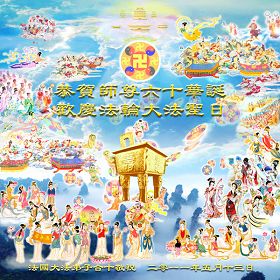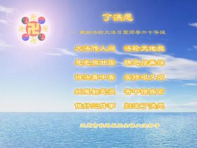 听课中,很多学员看到师父背后彩光映射。有的说:“台上有好多师父啊。”有个天目开了的学员,看到讲台变成一个大门楼,两扇大门都打开了,左右各站四位穿古代服装的武将,师父在门楼里面讲法。(当时他搞不清楚这些武将是什么人,后来听学员讲,这就是八大金刚。)课后,我跟师父说:“师父,我看到这礼堂的舞台竟是一只船,船周围浪花在翻腾;师父在船上庄严的讲法。我感到景象中的师父在说:‘我把这么好的法理,双手无条件的捧给你们,把你们带上路,还要再带你们一程。’”师父说:“对啊!对啊!我就是在度人啊!”
