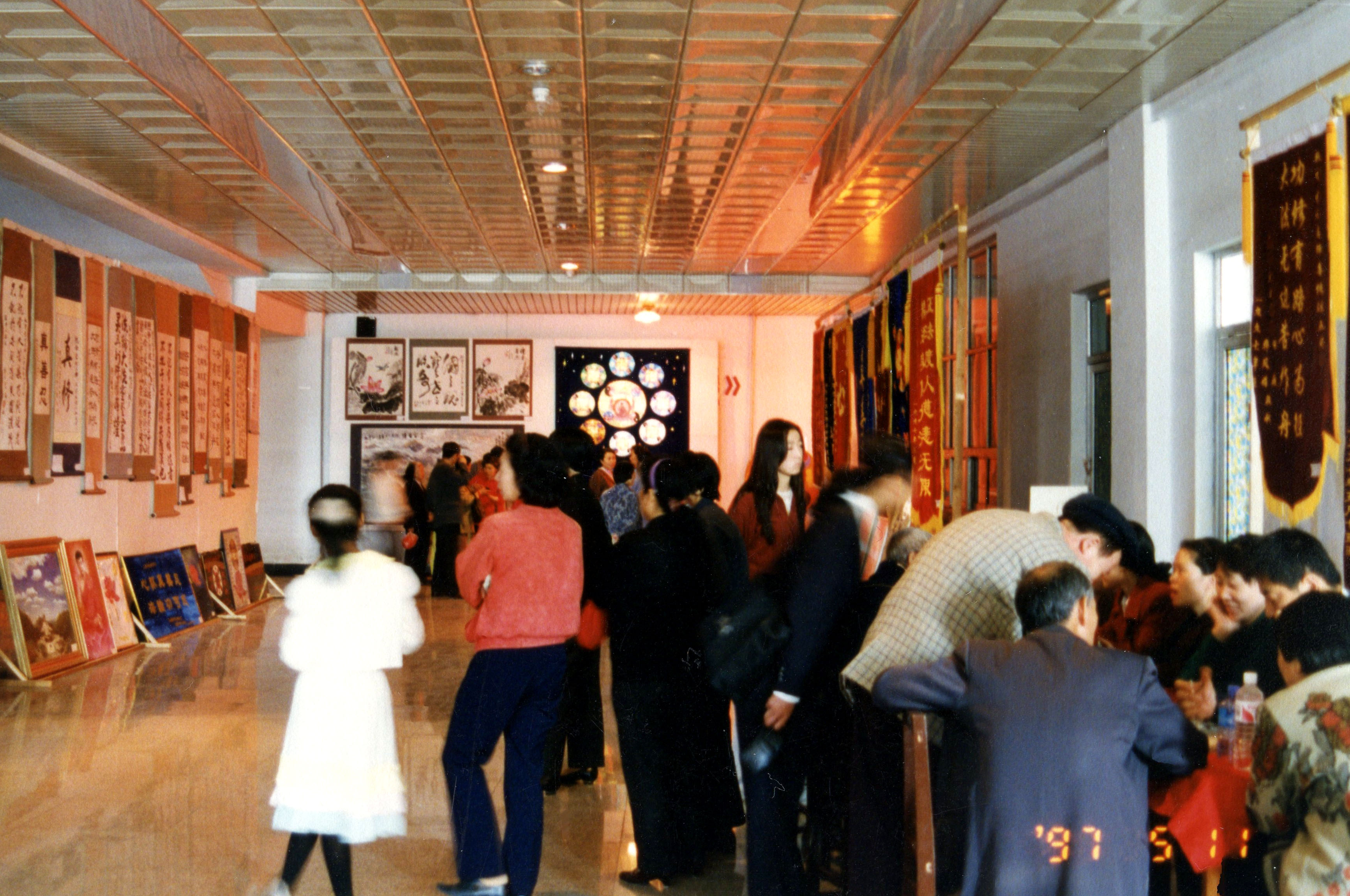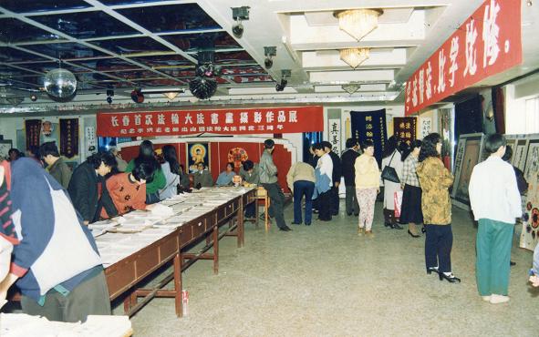 首届书画展是为了纪念李洪志老师教功传法三周年举办,一九九五年五月十日——十四日,在长春市高科技大厦展厅,展出有书法、国画、油画、版画、木雕、水彩画、布贴画、手绣、剪纸、锦旗、摄影照片及各种手工艺制品,还有手抄《法轮功(修订本)》和《转法轮》等六百五十五件。五天时间里,参观者有六千余人,来自于全国各地,还有美国朋友。