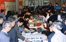 笔会分为两场:第一场笔会是来自书画界的三十多位名人,妙笔丹青,各展风采,其中大部份都是修炼人。这些书画艺术家们由大法牵线,缘聚画展。他们在观看画展后,乘兴挥毫泼墨,表达对师父和大法的赞颂。参与者每个人都被感动着,也用自己的书画感动着别人。每完成一幅作品,便高高的举起展示给参观者,然后悬挂在壁板上。名家亲临,其作品都是上乘之品,层次之高,品味之浓,为一般书画展所少见,真是盛况空前。笔会上,八十九岁的书画界老前辈为师尊贺寿,十岁的小弟子虔敬的书写“真善忍”三字真言。这种专家名流与民间书画爱好者、导师前辈与学子蒙童、国画的各风格流派和真草隶篆各种书法等,同场、同案共抒心声,这在书画界实为罕见,法轮大法牵系圣缘,开创如此辉煌。