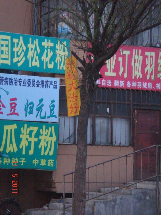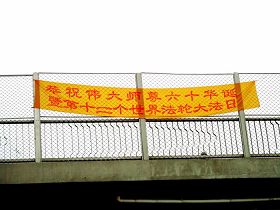 通讯员大陆报道)今年的五月十三日,是第十二届世界法轮大法日,是法轮大法洪传十九周年,是李洪志大师六十华诞。在中国大陆各地,出现很多庆祝“五一三”的真相条幅和标语。以下是出现在大陆某市的庆祝世界法轮大法日的真相条幅和胶贴。