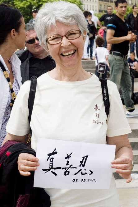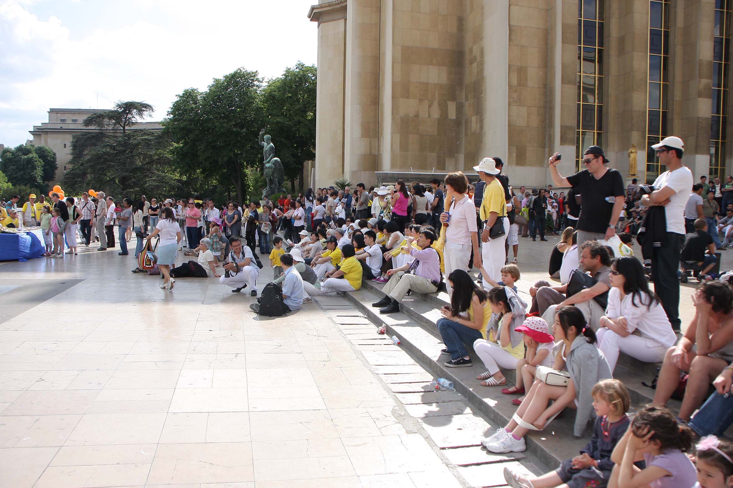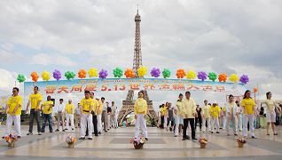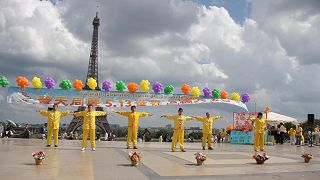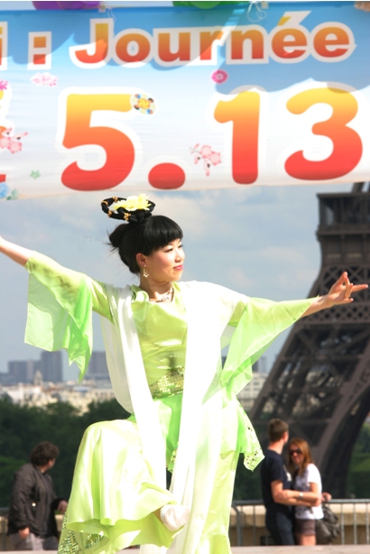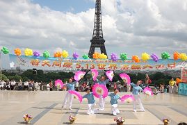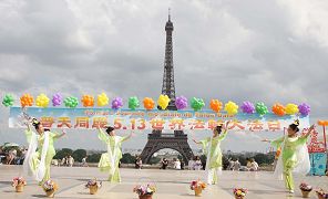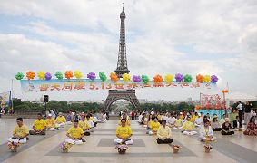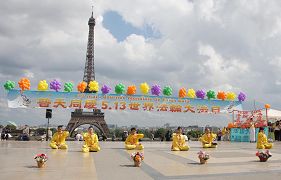 【明慧网二零一一年五月十四日】(明慧记者关宇宁、周永毅法国巴黎报道)二零一一年五月十三日是第十二届世界法轮大法日,也是法轮功创始人李洪志先生六十华诞。五月八日,部份法国的法轮功学员在巴黎埃菲尔铁塔正对面的人权广场上集会,通过功法展示、中国传统舞蹈和民乐演奏等方式欢庆世界法轮大法日,恭贺师尊六十华诞,同时向人们展示法轮大法的美好,把修心向善、生命找寻到返本归真之路的喜悦带给世人。