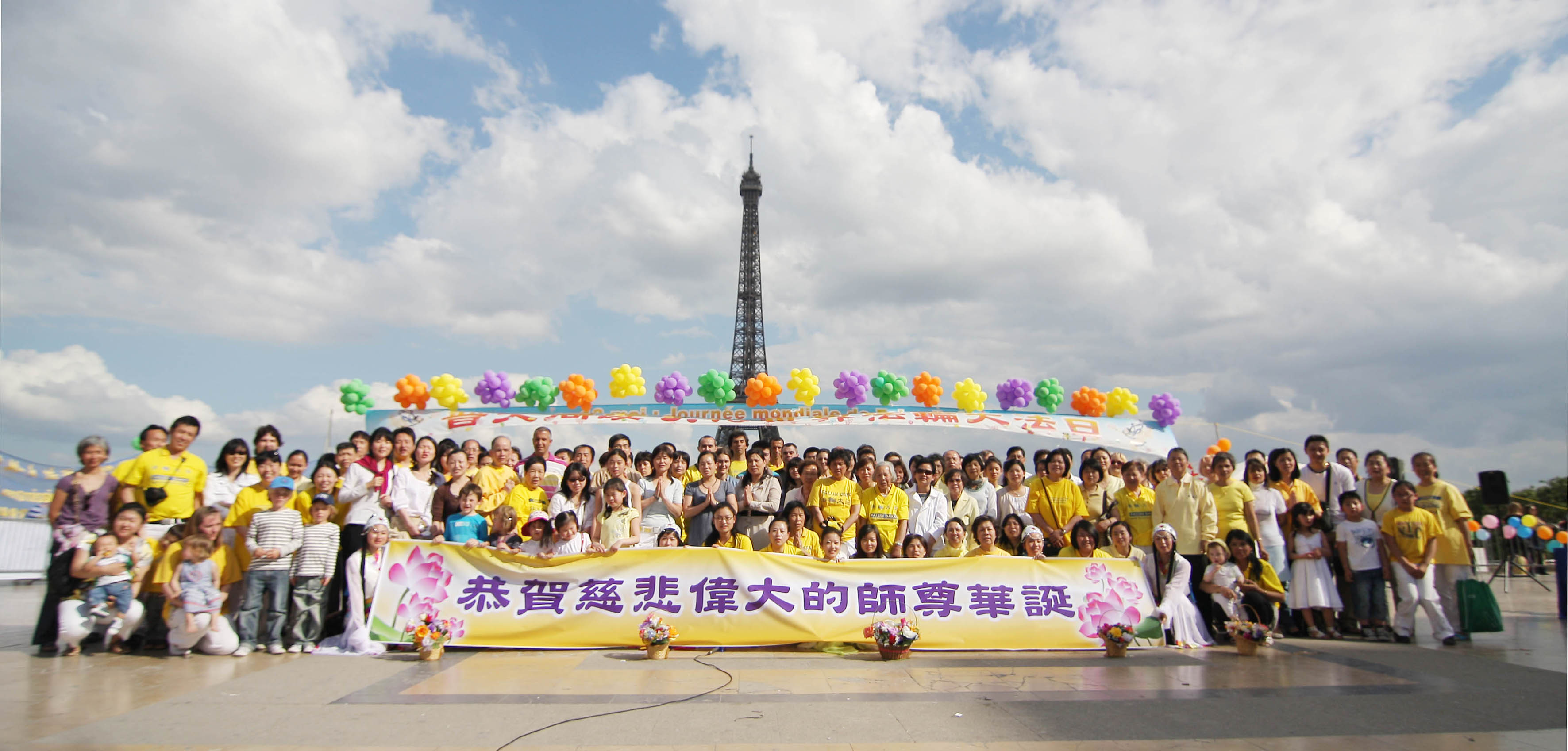 法国法轮功学员齐声道:“法轮大法好,祝师父六十岁生日快乐!