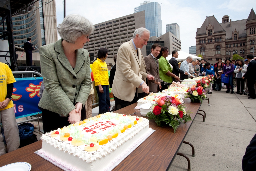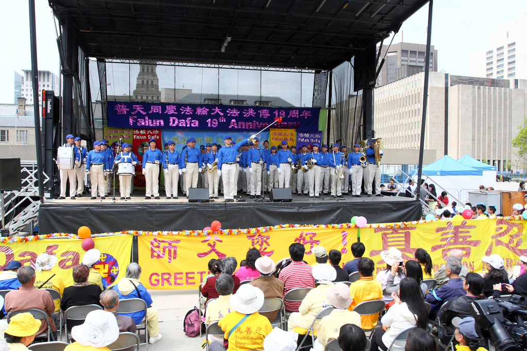 【明慧网二零一一年五月十五日】(明慧记者章韵多伦多报道)二零一一年五月十三日是李洪志先生六十华诞,也是第十二届世界法轮大法日,在这一普天同庆的日子里,加拿大多伦多的法轮功学员与支持法轮功的各界人士一起,在多伦多市府前的弥敦尔•菲利浦广场(Nathan Phillips Square)举行大型集会和集体炼功,以诗歌、舞蹈及音乐的形式,向世人颂扬法轮大法的美好,表达他们对师尊的感恩。八名省、市议员及社区领袖到场祝贺,他们和民众一起欢呼:“法轮大法好!”