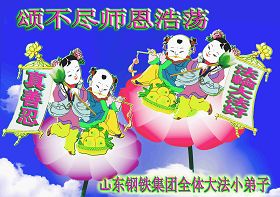 山东莱钢三退后的离退休人员在恭祝李大师生日快乐时写到:“我们相信,乌云是遮不住太阳的,神目如电,行恶者是逃不脱天理的惩治的!”他们写到“自从共产邪灵出现在中华大地上那一刻起,就给这里的人民带来了无穷的灾难,使人们丧失了自己的信仰,道德沦丧,如果不是李大师的慈悲救度,不知有多少生命做了中共邪党的殉葬品!我们衷心感谢慈悲伟大的李大师!”