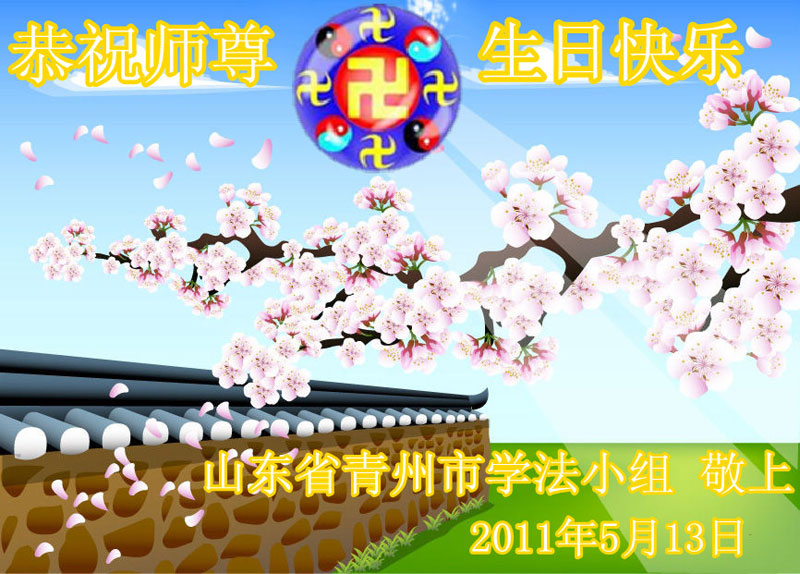 “四川成都地区各大学全体大法弟子恭祝伟大师尊生日快乐:值此伟大师尊六十华诞来临之际,我们四川成都地区各大学全体大法弟子恭祝师尊生日快乐!千言万语,表不尽对伟大师尊的思念;千恩万谢,谢不完伟大师尊给予我们的恩德。我们谨记师尊教诲,做好大法弟子应做的事,在修炼中不断精进,再精进。二零一一年五月十一日”