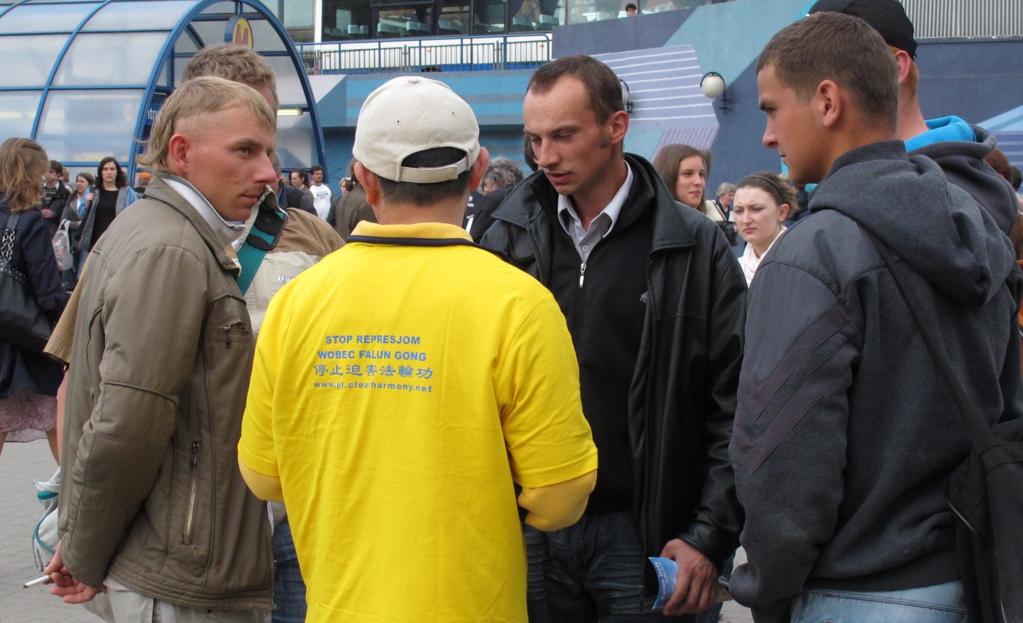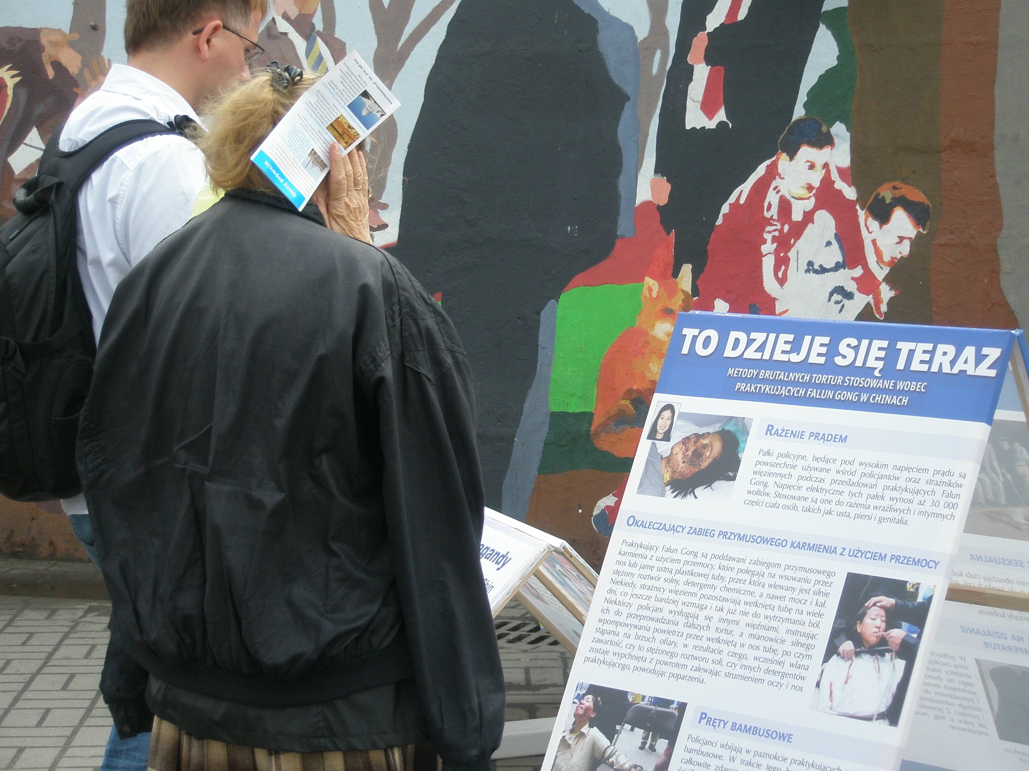 一位年轻的姑娘在听法轮功学员介绍中共对法轮功迫害时,一手不由自主地抬起盖住额头,甚至连眼睛都想蒙起来,“这太邪恶了,共产党是这么邪恶的东西,我庆幸波兰没有了共产党,庆幸我有了解法轮功真相的自由。”