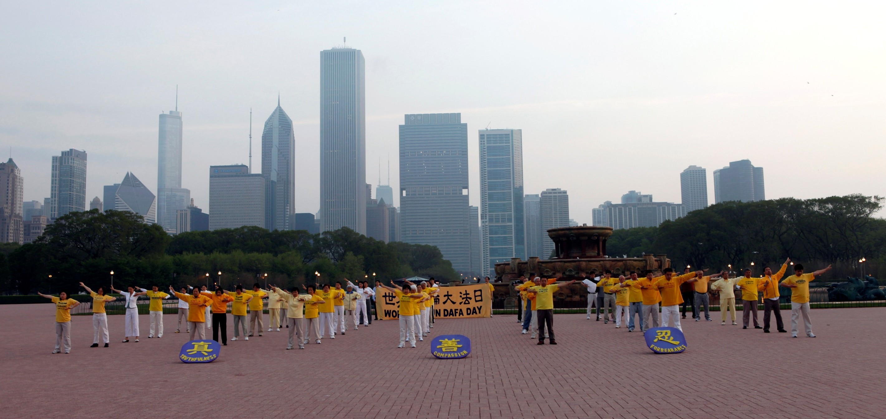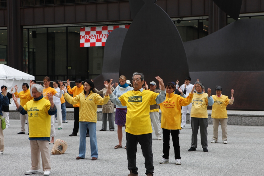 【明慧网二零一一年五月十五日】二零一一年五月十一日清晨,法轮功学员们在芝加哥著名的格兰特公园(Grant Park)集体炼功活动;五月十三日,芝加哥法轮功学员又汇聚在芝加哥市中心的戴利广场,以集体炼功和真相图片展方式,庆祝第十二届世界法轮大法日暨法轮功创始人李洪志先生六十华诞。活动吸引了不少行人观看,还有人表示要学习法轮功。